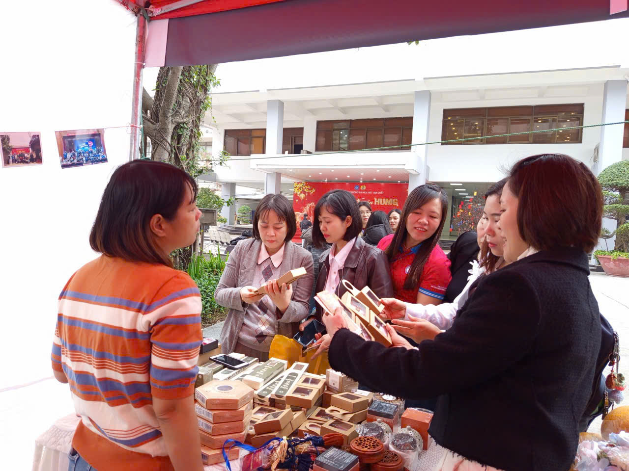 Cán bộ nhân viên trong Trường vui vẻ mua sắm tại gian hàng của Khoa Dầu khí và Năng lượng